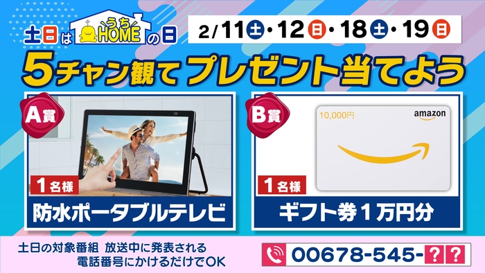 対象番組で表示される電話番号にかけてスタンプGET!HOMEの放送をみて豪華プレゼントを当てよう♪