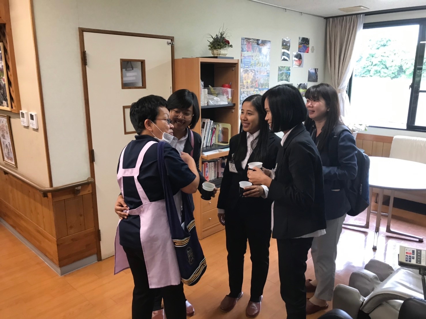1ヶ月間の講習を終えた彼女達は、監理団体の同行のもと就業先である静岡市内にある介護老人保健施設へと向かいました。施設に到着すると外には職員が出迎えており、彼女たちの緊張は一気に解けていきました。大きな応接室に案内されると雇用条件に関する書類の最終確認が行われ、彼女たちは正式な職員に。先輩職員からノートやネームタグ、周辺の観光案内雑誌、式典等に参加する時に着られるブラウスをプレゼントされると、嬉しさのあまりはしゃぐ姿を見せてくれました。一通りの手続きを終えた後は、これから生活する寮に向かい、家電等の説明を受け、明日からの生活に備えて日用品や食料品の買い出しに。夕食は歓迎会を兼ねた食事会が開かれ、施設職員の手厚い歓迎に彼女たちはすっかり打ち解けました。