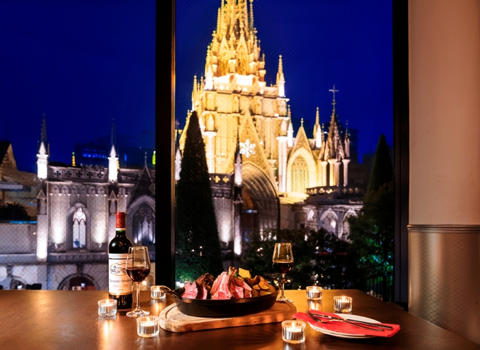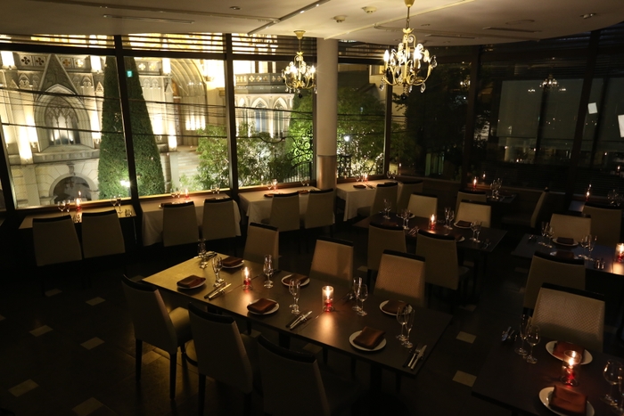 店内の全席からライトアップされた「青山セントグレース大聖堂」が望めるロマンティックな空間は、誕生日や記念日などの特別なデートにもおすすめ。期間限定のお得なショートディナーコースをお楽しみください。