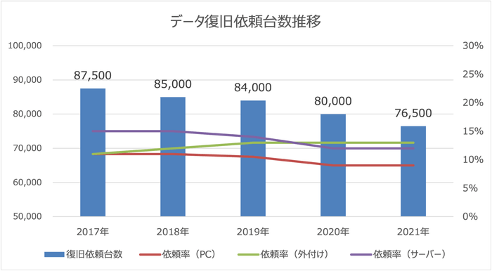 2021年のデータ復旧市場規模について統計データを発表 パソコン(PC)のデータ消失率に変化 新型コロナウイルスおよびランサムウェア被害の影響 2021年(1~12月)データ復旧依頼数は76,500台と推定