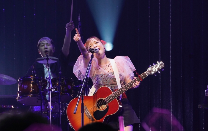 最初のMCで「こういうご時世の中、足を運んでいただきまして本当にありがとうございます! 私も緊張しています。ライブ自体は1年3ヶ月ぶりぐらいですけど、バンドメンバーとのライブは猛烈に久々なので、何年も歌ってる曲の冒頭の歌詞を忘れてしまうぐらいに(笑)」と、久しぶりのツアーに対して嬉しさと緊張のどちらも感じていると話した。