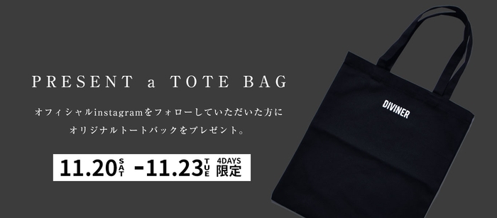 上記期間内に全国のDIVINER実店舗へ来店&DIVINER公式インスタグラムをフォローしていただいた方全員に「ロゴ入りトートバック」をプレゼント。