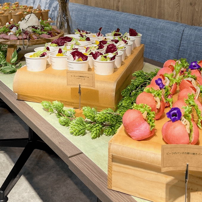 ①会場には、シェフサービス、もしくはシェフの料理をワンウェイで提供する「お届けサービス」がオススメ。個包装やカップ等に小分けした料理をお届けします。