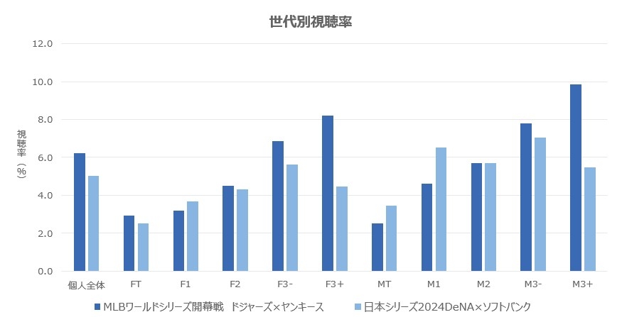 年齢が高くなるにつれ、MLBワールドシリーズの視聴率が高くなり、対して男性若年層(MT、M1)は日本シリーズの方が視聴率が高い傾向となっていました。これはMLBワールドシリーズが朝から放送開始しているのに対し、日本シリーズは夕方から放送開始という放送時間帯にも関連している可能性が考えられます。