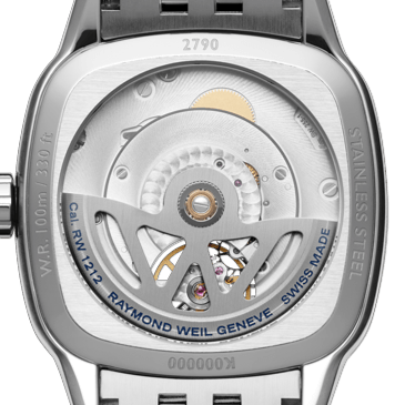 6時位置のオープンワークとケースバックから、インハウスムーブメントRW1212を鑑賞することができます。ローターは、ブランドのイニシャル“W”を象っています。1212は、レイモンド・ウェイルの本社が位置する、ジュネーブ州グラン・ランシーの郵便番号に由来。
