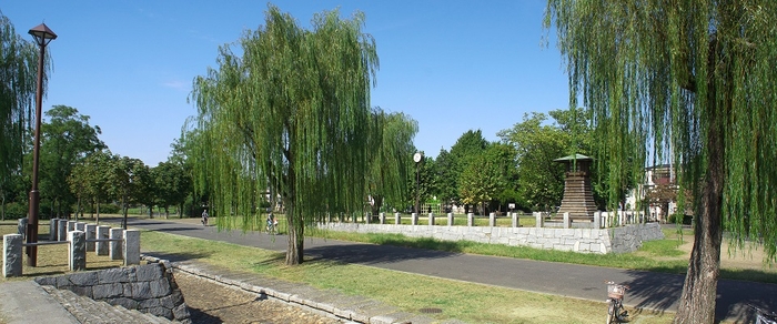 千葉県との境を流れる江戸川の堤防の西に広がる公園。広い草地があります。広場と運動施設を備え、緑地の少ない東部地区にあっては、貴重な存在といえます。周辺に大きな建物がないため、空が広く、公園も明るく広々とした雰囲気をもっています。春は桜の花見で賑わい、夏は色とりどりのアジサイを楽しむことができます。秋はケヤキやメタセコイアなどの紅葉が色あざやかとなります。