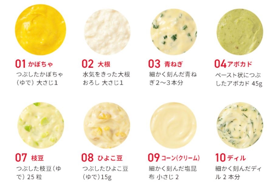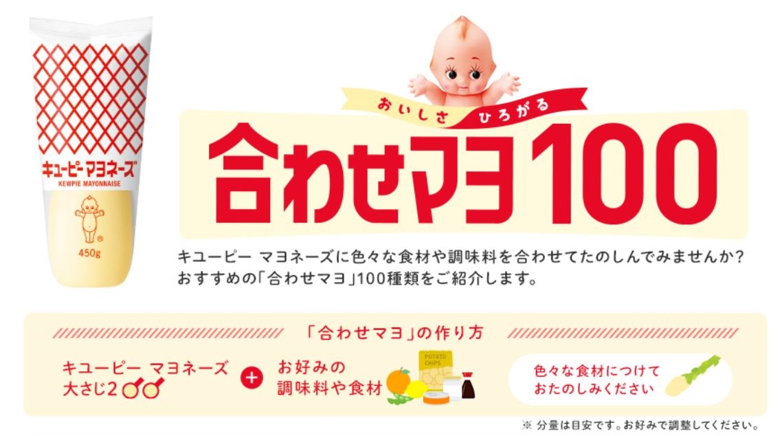 さらに、調味料や食材を合わせてつくる100種類の「合わせマヨ」の特設サイトを開設しました。他の調味料と合わせれば味わいも広がります。