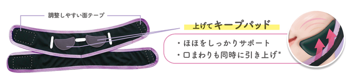忙しい現代人にとってもタイパが理想的な商品です。簡単に装着できるため、日常生活時やリラックスタイム時に、何かをしながらでも取り入れやすくなっています。また、伸縮性のある繊維を使用しており、肌にやさしくフィットすることが特長です。快適な装着感を提供しながら、効果的にたるみを改善のサポートをします。