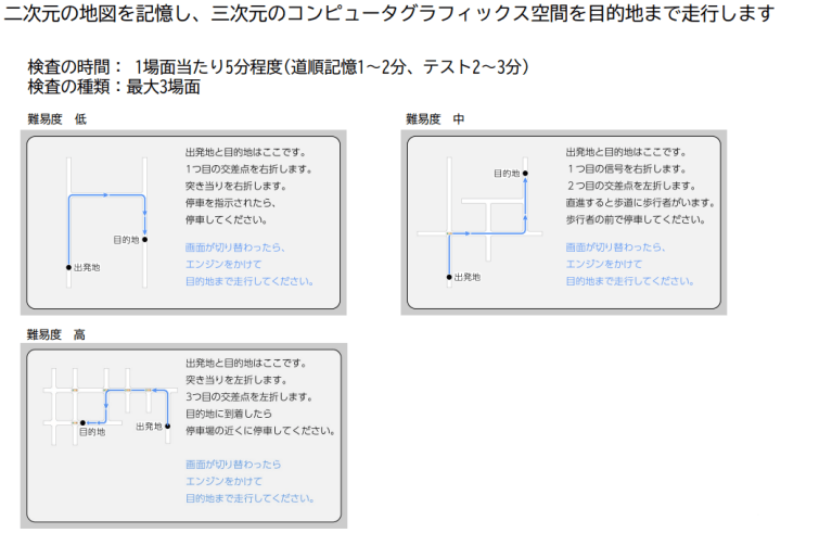 スタート地点からゴール地点までの二次元マップをみて走行ルートを記録します。その後、記憶を頼りにゴール地点までシミュレーション走行ができるかどうかの計測を行います。
