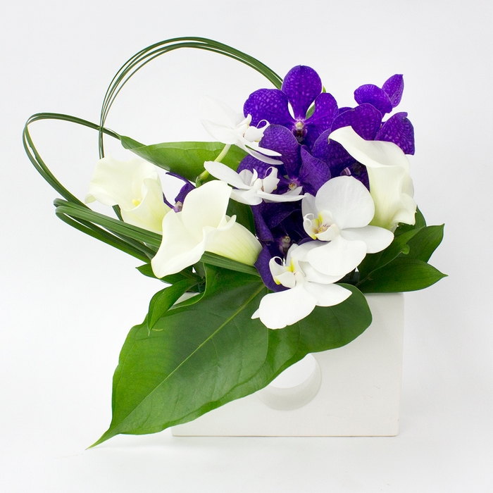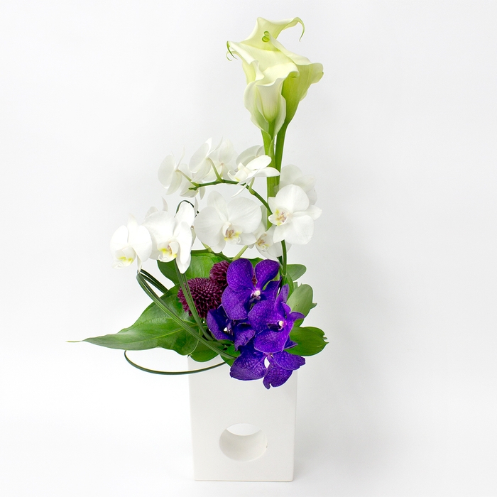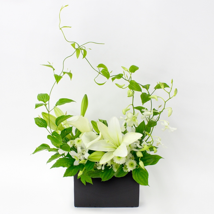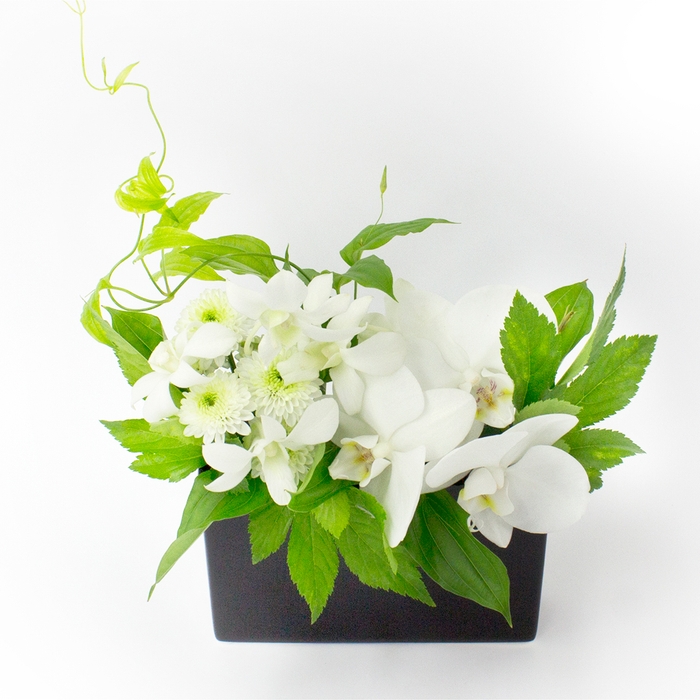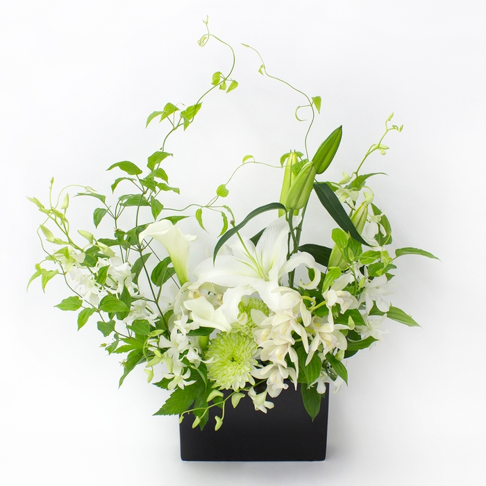 蘭やスタイリッシュな葉物をメインにデザインされたお供え花。