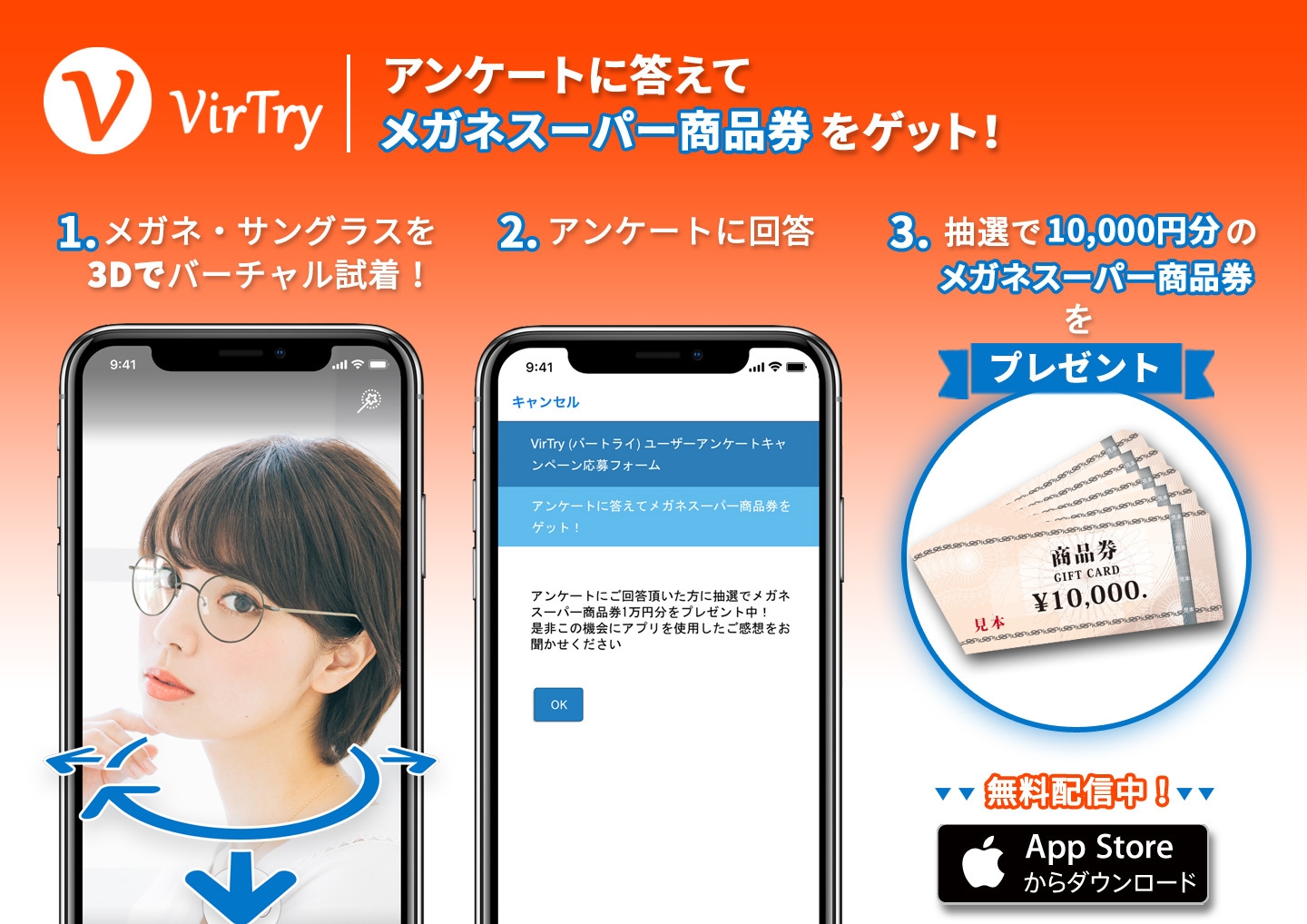 Webサービス・モバイルアプリの企画・運営を行う株式会社DMR(所在地:東京都港区、代表取締役:岡本 浩) は、同社が手がけるメガネ・サングラスの3Dバーチャル試着アプリ、VirTry(バートライ)( https://app.virtry.net/about-eyeglasses/ )にて、2019年9月27日より抽選で全国のメガネスーパー各店舗で使えるメガネスーパー商品券 税込1万円分が当たるアンケートキャンペーンを実施しています。