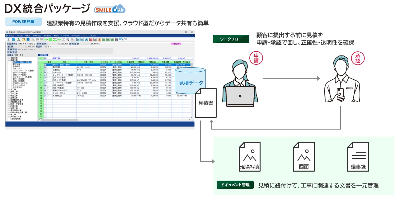 このたび提供開始する『SMILE V Air POWER見積』は、好評を博しているオンプレミス型と同様に、建設業特有の見積作成から案件管理、実行予算作成までを支援します。クラウド化により運用管理の負担軽減、時間・場所の制約解消、容易なデータ共有を実現し、作業を効率化することができます。