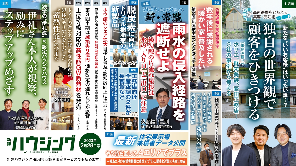 ニュース面では、住宅展示場来場者の最新データや、工務店向けの経営コンサルティングを手がけるソルト(山口県防府市)代表の青木隆行さんが発起人となって立ち上げた「ビジョナリー工務店の会」の初会合の模様などを詳報する。