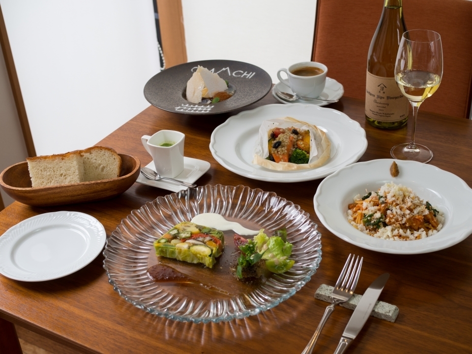 シェフが吟味したこだわりの信州食材をふんだんに盛り込み、北アルプス国際芸術祭テーマ「水・木・土・空」を表現したコースです。地元になじみの深い食材も、シェフの遊び心によって一皿ごとに驚きや発見が!※要予約(最大20名様まで)