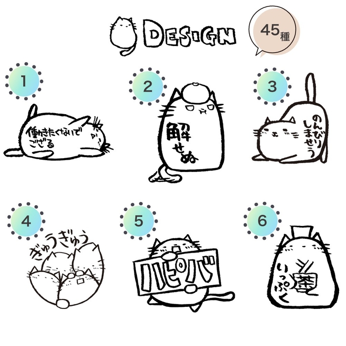 デザイン数: 全45種類の「ゆる猫たち」が、それぞれの気持ちを個性豊かに表現。