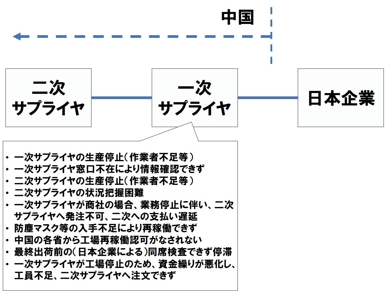 ●一次中国サプライヤが工場停止のため、資金繰りが悪化し、工員不足、二次中国サプライヤへ注文できず