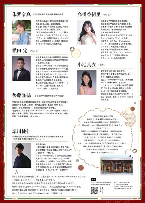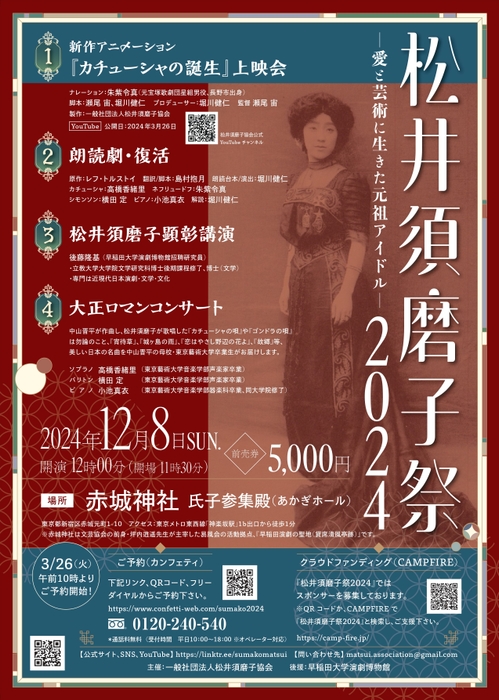 一般社団法人松井須磨子協会主催、『松井須磨子祭 2024』が2024年12月8日 (日)に赤城神社 氏子参集殿[あかぎホール](東京都新宿区赤城元町1-10)にて開催されます。