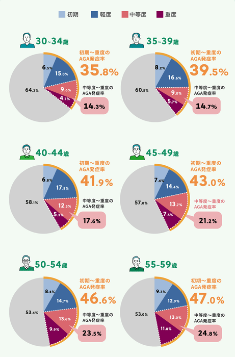 年齢が上がるごとに、進行した状態を選択する割合が増えていきますが、30~34歳の若い階級でも、AGA発症率は35.8%で、中等度以上((5)III型以上)のAGA発症率は14.3%(約7人に1人)と回答され、30歳以前より治療が必要となるケースがあることが分かります。