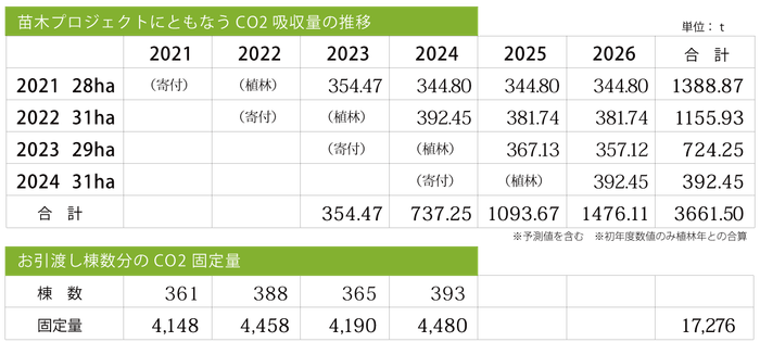 「花まるクレジットポイント」とは、「e-kenet Visaカード」のご利用に応じて進呈されるポイントです(一口1,000円単位で交換)。今回の寄付額には、2024年11月末までに「花まるポイント」から「苗木を還そうプロジェクト」へのご寄付を賞品として交換していただきました20口分が含まれます。