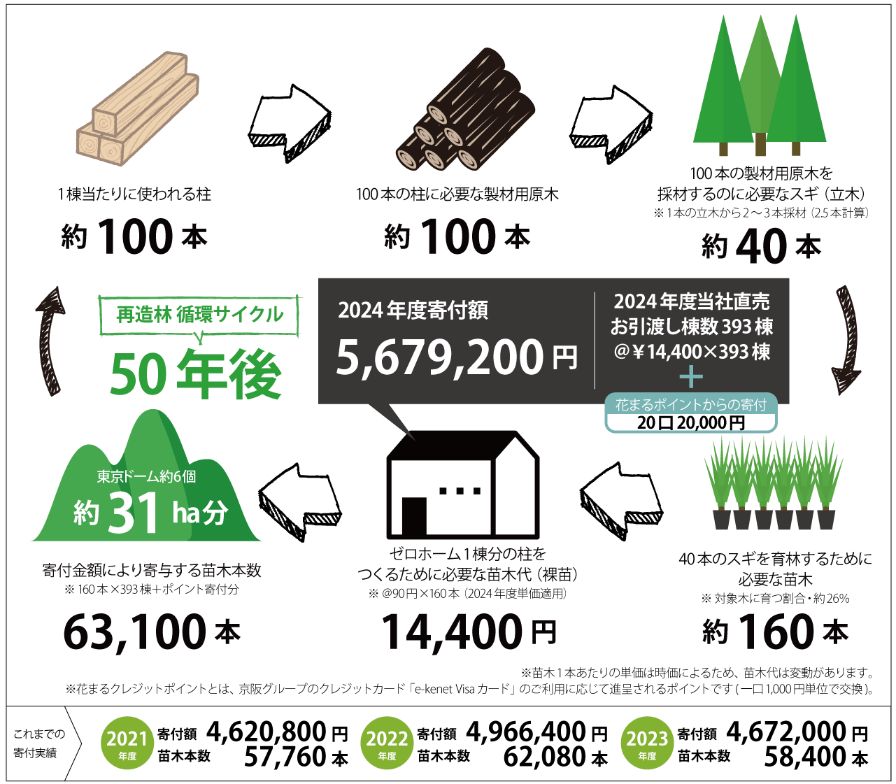 株式会社ゼロ・コーポレーション(本社:京都市中京区、社長:菊本雅幸、以下「ゼロホーム」)は、宮崎県のスギ植林・育林を目的とする再造林支援2024年度分として、約567万円の寄付金の贈呈を2024年12月に行いました。この寄付は、ゼロホームが独自で進める「苗木を還そうプロジェクト(以下、「苗木プロジェクト」)」の一環として2021年にスタートし、今回で4回目です。同プロジェクトにおけるこれまでの寄付金合計は、約1993万円となりました。