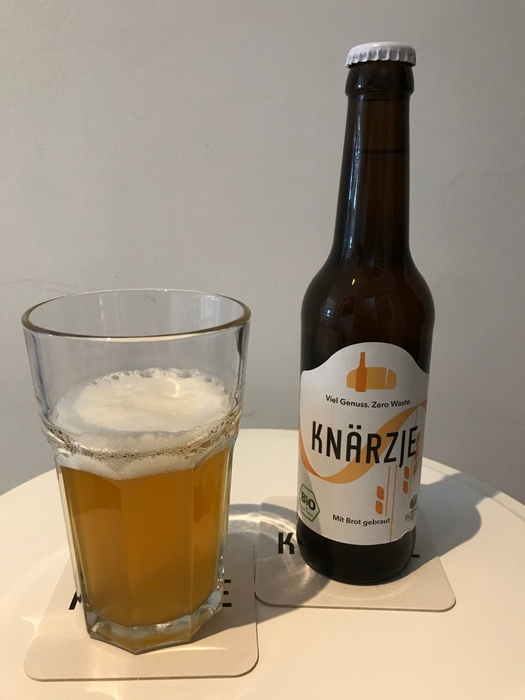 ビール小瓶1本に含まれるパンの量は18〜19g、ちょうどパン1切れ分です。こうして誕生したこのブレッドビアは「Knarzje」(クナーツィア/ aはaウムラウト)と名付けられました。クナーツィアとは「パンの切れ端」を意味するドイツ・ヘッセン地方の方言。その名が示す通り、捨てられるはずだった1切れの「クナーツィア」が1本の「Knarzje」に生まれ変わったのです。