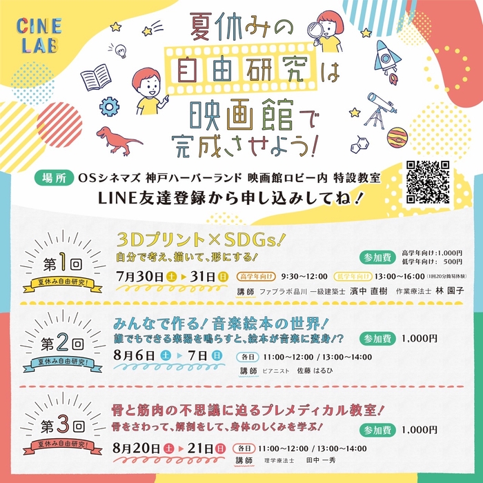 その第1弾として、各分野の専門家が子ども向けに体験コンテンツを提供する「CINE LAB(シネラボ)」を、OSシネマズ神戸ハーバーランドにて開催いたします。小学生の夏休みの自由研究に、クリエイティブな発想で問題解決を創造できるSTEAM教育(※1)を映画館で体験しながら、宿題も完成させられる新しい取り組みとなります。