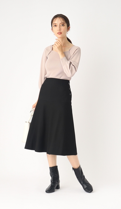 サイドボタンがポイントになった単品でも着まわしやすい切り替えフレアスカート。腰回りをカバーする位置で切り替えているため、きれいにフレアシルエットが出るようになっています。