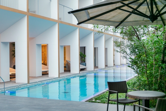 高く伸びる片流れの屋根が印象的で、傾斜のある西側壁面を覆う木製ルーバーは建物と周囲をつなぐデザインとなっています。特徴的な外観とこだわりのある内装が評価され、2020年度「日本建築家協会優秀建築選100作品」に選ばれたほか、2024年には建築・デザイン・アート・ファッション・旅など好奇心旺盛に人生を楽しむをテーマにした月間ライフスタイル誌である「Casa BRUTUS」で特集された「日本のデザインホテル100」にも選ばれました。