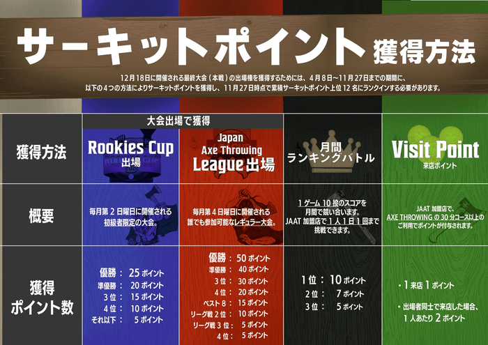 *サーキットポイントとは、最終大会(本戦)に出場する12名を決定するために用いる指標のことで、参加者はJAAT主催の予選大会等で貯めることが可能となります。