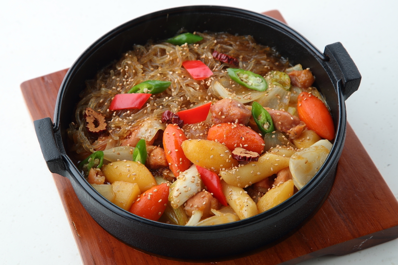 韓国語で「蒸し鶏」という意味で、醤油ベースのタレで煮込んだ鶏肉料理です。鶏と野菜のうまみを存分に楽しめる煮込み料理で、「タンミョン」とよばれる韓国の春雨もアクセントになっています。
