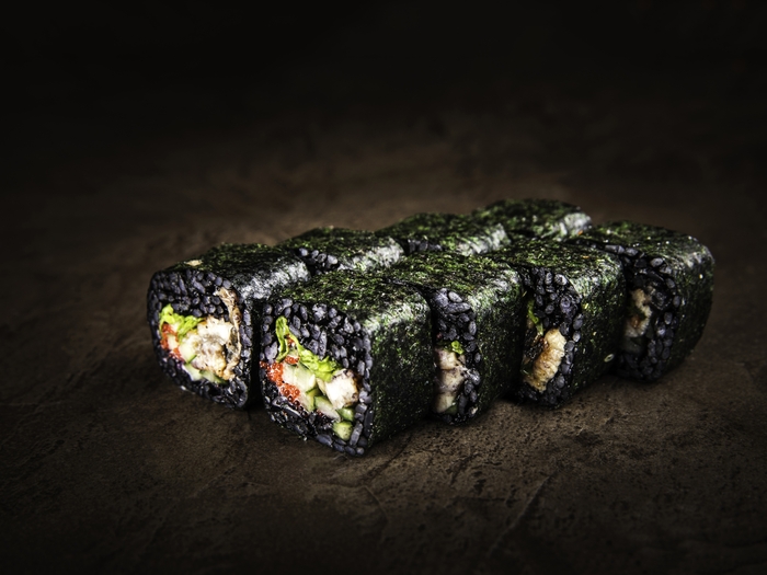 麻炭ご飯(酢飯)、アボカド、エビ、海苔、白ごま、レモン汁