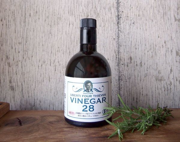このビネガーは疫病が蔓延した中世フランスで、難を逃れた4人の泥棒たちの秘密のレシピから始まりました。このレシピは伝説のレシピとして、1748年から今もなお、フランスの公式な薬局方であるCodexにも登録されていることでも知られています。約300年の時を経た今、フランス人のナチュロパス(自然療法士)であるルイ・ウベルティが「世界中の人々が健康で幸せであってほしい」という願いを込めて、このレシピを元に、ウベルティ社オリジナルのアップルサイダービネガーに植物エキスをブレンドし、ハーブやスパイスをきかせたビネガーを現代に蘇らせました。