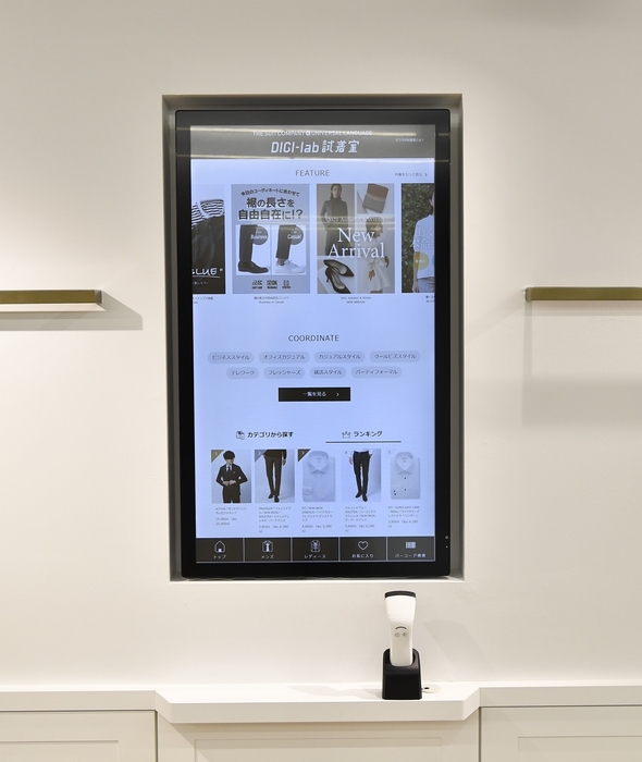 このような状況下、これまでそれぞれに展開していた4つのブランドを1つの店舗で体験できる新しい店舗形態「TSC SQUARE」を開発しました。2021年10月に初出店した新宿本店(東京)は想定の1.5倍の売上で好調に推移しており、現在5店舗にて運営しています。この店舗形態を可能にしたのが、デジタルツールを活用した当社独自システム「デジラボ試着室」です。これは、リアル店舗で実際に生地感やサイズの確認、スタッフの接客を受けながら店内に設置したタッチパネル式の大型サイネージやタブレットを通じて、全ブランドの豊富なEC在庫からお好みの商品を選ぶことができます。そのため、売場面積を通常の約5割に縮小しながらも、多様化するビジネスウェアニーズへの対応が可能となりました。また、店頭商品をサイズゲージとして試着することでEC購入の不安を払拭します。