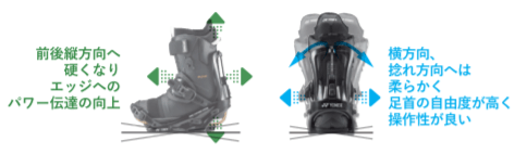 横方向へは自由度が高く、フリースタイルの動きに的確に対応しながら、硬さの異なる3種類のカーボンシャフト(ハードフレックス・オールラウンド・ソフトフレックス)の中からお好みのシャフトに交換することで、ハイバックの硬さが変化します。前後のバインディングで異なる硬さのシャフトを使うなど、細やかな調整が可能で、シーンごとに求められるフィーリングにカスタマイズできます。