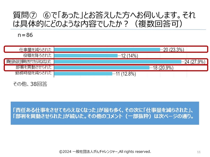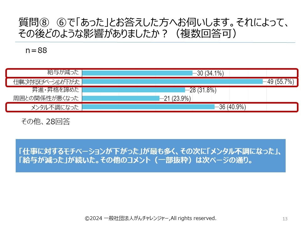 昨今、国(厚生労働省)の後押しもあり、企業・団体において、「治療と仕事の両立」についての制度普及などが進んできていますが、治療しながら仕事を継続できる環境が整いつつある一方、「がん治療からの復帰後や治療と両立している最中に、自分の意思とは無関係に職務内容や勤務時間が変わったり(減ったり)、その結果社内における出世コースから外れていったりする」事象があることが分かってきました。