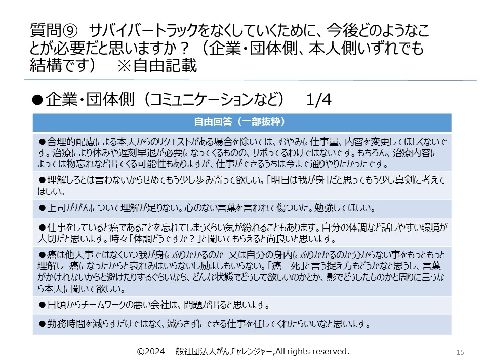 一般社団法人がんチャレンジャー(所在地:千葉県柏市、代表理事:花木裕介)は、この度、がん罹患経験者の皆様のご協力により、「サバイバートラック」に関するアンケートを実施し、その調査結果の無料公開を始めました。(調査期間:2024年4月1日(月)~5月19日(日))