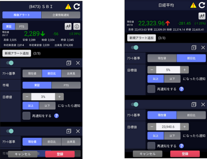 個別銘柄の株価や日経平均などの指標が設定条件に達した場合に通知する機能を追加。現在値からの乖離率や前日比により条件を設定することが可能です。