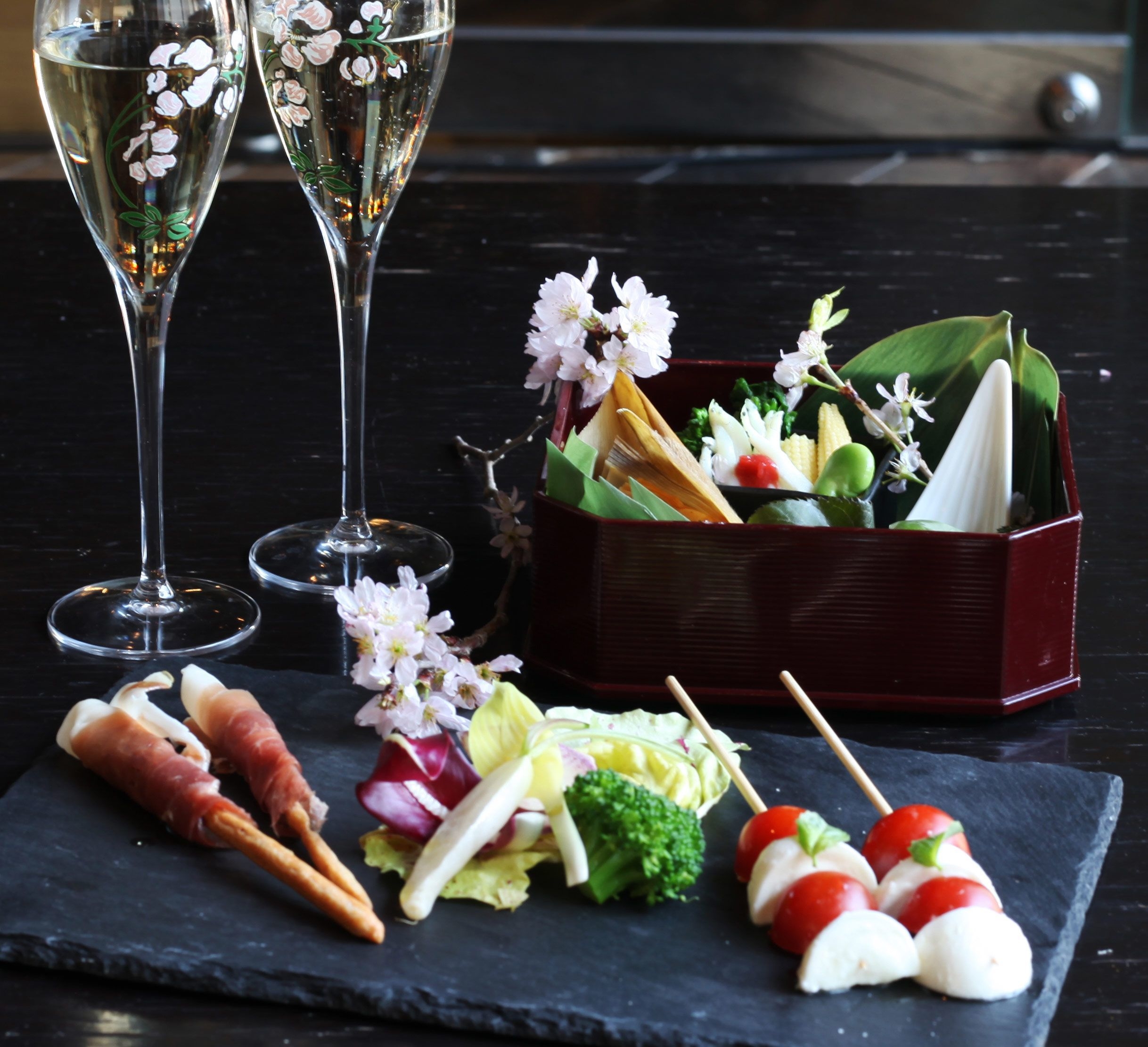 aburiyaki & sushi AnとSalvatore Cuomo Bros.より自慢のおつまみをご用意いたしました。The BARにて夜桜を見ながらゆっくりとおくつろぎください