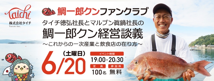 タイトルは、「タイチ徳弘社長とマルブン眞鍋社長の鯛一郎クン経営談義~これからの一次産業と飲食店の在り方~」と題し、これからの食について、生産者、飲食店、経営者、一般消費者がズームでつながり、アフターコロナに向けた「よりよい社会づくり」について考えることを狙いとしています。