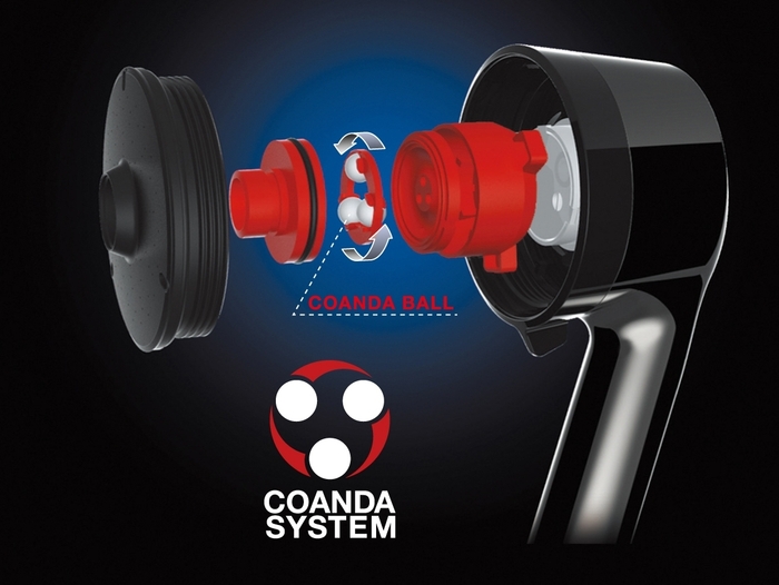 ジェットウェーブ水流はシャワーヘッド内部に組み込まれた特許出願中のコアンダシステムにより実現。これは水の軌道を変化させる3つのボールが1回転で3ショットを放つシステムで、毎分約1,500回転することで約4,500回の刺激を生み出します。このジェットウェーブ水流をあてることで、疲れた肩や腰、ふくらはぎ、足裏にリズミカルでパワフルな刺激が体感できます。