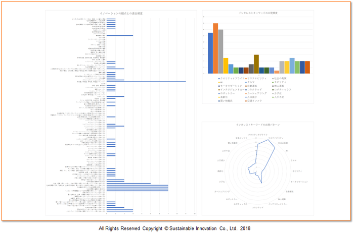 - 入力としてピックアップする言葉は、事業を通して実現したいこと、すなわち、事業の目的を表現したキーワード(以下、インタレストキーワード)です。このインタレストキーワードは、当社がイノベーションへの道筋と過程を描くために洗い出した105個のイノベーションの観点(イノベーションへの道しるべとなる)に内包されるキーワード(以下、コロケーションワード、現在約1,500個をキーワードデータベースに登録)と比較し結合親和性(一致数)として評価されます。