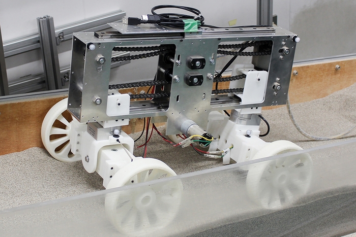 芝浦工業大学(東京都港区/学長 村上雅人)機械制御システム学科の飯塚浩二郎准教授は、前後のタイヤ間隔を伸縮することで、粒子が細かく移動が困難な軟弱地盤でも前進できる車輪走行システムを開発しました。月面など惑星表面のレゴリス(細粒物の軟弱地盤で、砂上や田んぼなどのぬかるみも同様)では、タイヤが回転するとどんどん埋まってしまい、その場から動けなくなる問題がありました。