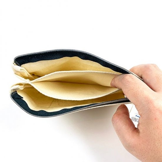 フラットなポーチが2つくっついたような仕様です。仕分けもできて収納力もありますが、マチがほとんどない分、かさばらないのも嬉しいですね。