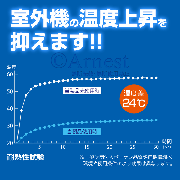 室外機の天面に貼り付けるだけで、約24℃も表面温度の上昇を抑えて、エアコンの冷却効果を高めます。