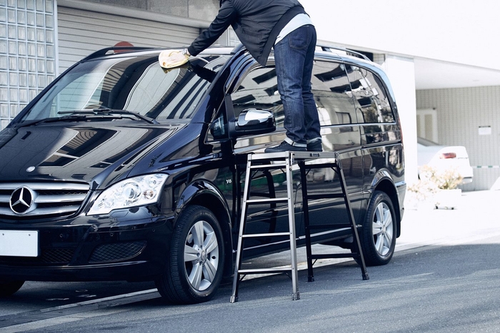 当製品は、製品ボディをブラックで統一しデザイン性と機能性を兼ね備えた、上質でスタイリッシュな洗車台です。天板の上を移動することでルーフ洗浄の作業効率を飛躍的に高めることが出来ます。収納時は、脚部を折りたたみコンパクトになるので、車のトランクなどに収納することが出来ます。また、持ち手付きなので、持ち運びが便利です。
