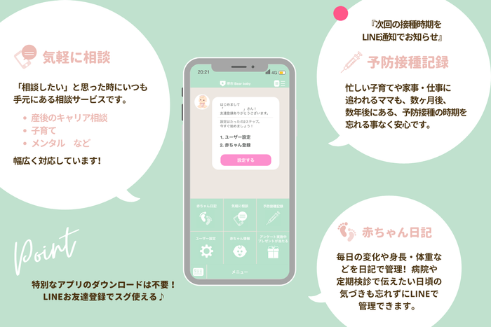 「Bear baby (ベアーベビー)」では、子育て世代の仕事や育児への悩みや不安・ストレスなど、「相談したい」と感じた時に専門のカウンセラーとオンラインで相談できる『気軽に相談』機能を搭載し、第三者への相談をより身近なものにします。