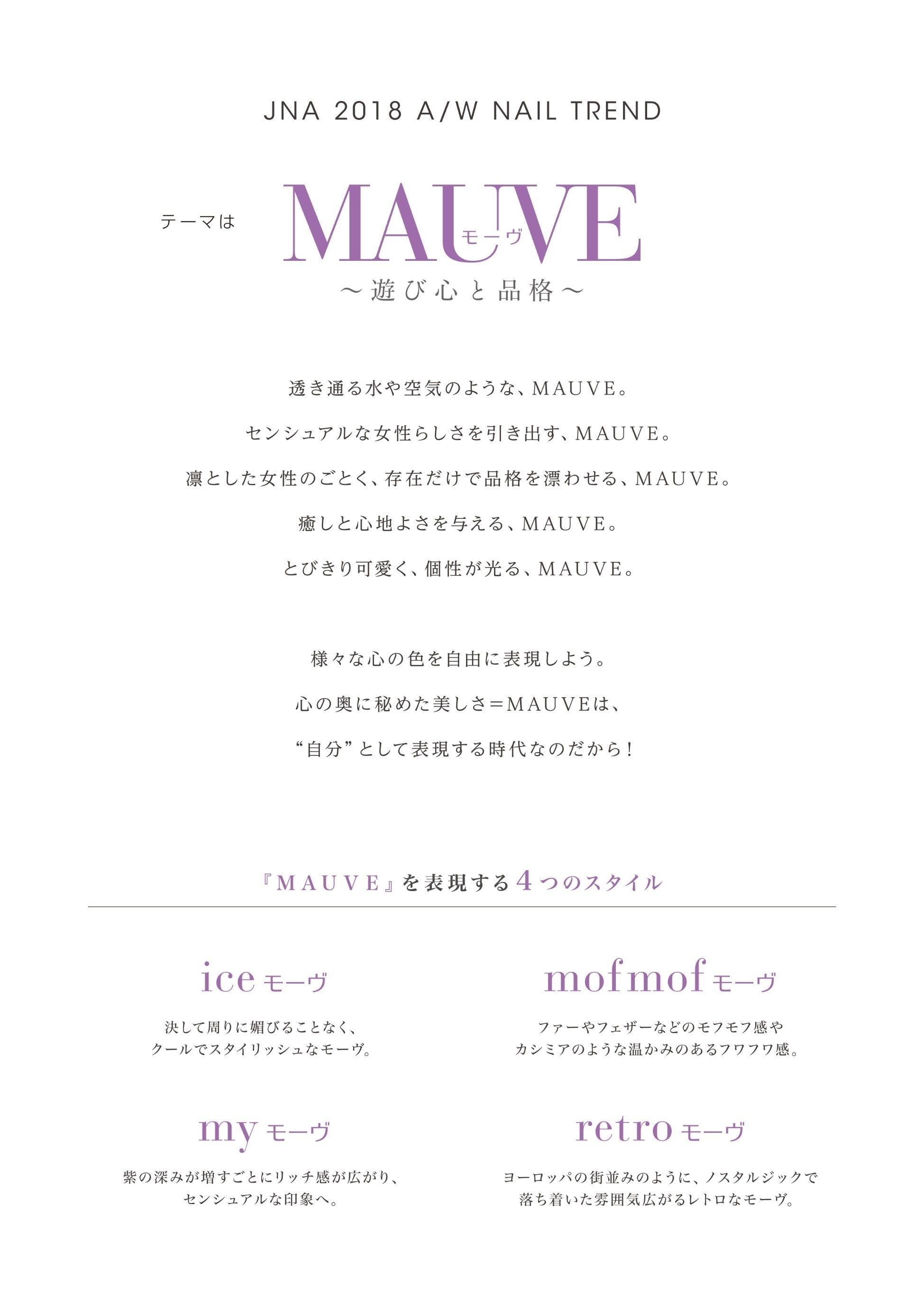 NPO法人日本ネイリスト協会(略称 JNA/東京都千代田区/理事長:瀧川 晃一)は、2018年秋冬のネイルトレンドのテーマを「MAUVE(モーヴ)」とし、このテーマを表現する作品を発表します。