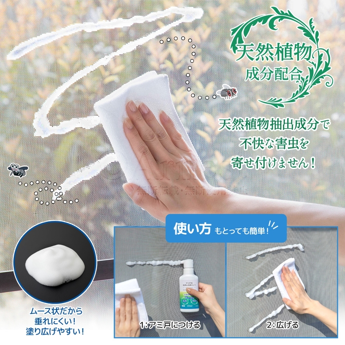 隙間から入ってくるイヤな虫をシャットアウト!天然成分でアミ戸を洗浄しながら虫除けのダブルの効果「アミ戸用洗浄&虫除けムース」