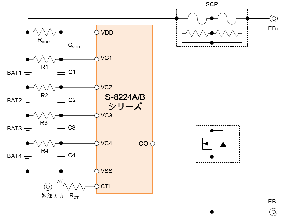 また、出力制御機能によりPTCを用いた温度保護機能を付加することができるため、過充電だけでなく、異常温度も検出することが可能です。さらに「S-8224Bシリーズ」は充電制御用FETのゲート接続端子に出力電圧制御回路を備えているため、ゲートソース間耐圧が12VのFETも使用可能です。