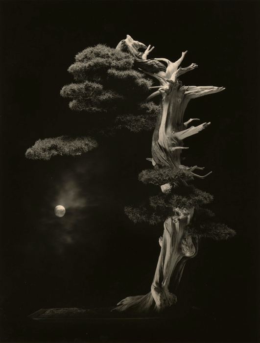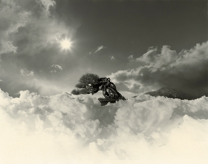 さらに、山本は、それまでの説明的な部分を削ぎ落としたイメージから一転して、雄大な実景の中に盆栽を置いて撮影するスタイルへと移行していきました。山本は、盆栽の魅力について「盆栽と同じ空間で時間を過ごすうちに、盆栽が場にもたらす極めて強い緊張感がやがて感動に変わり、そして心に平和がもたらされた」と言います。小さな鉢の中で、人の手と水によってのみ生きる盆栽。盆栽は、それ自身が盆栽師の手によって完成された世界を持つ芸術作品であり、それを自身の作品として写真に表現することは、非常に大きな挑戦でした。
